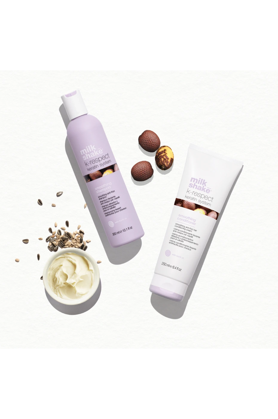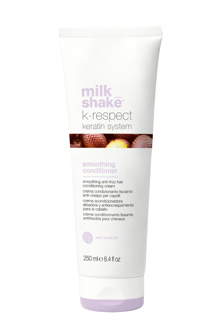 Milk Shake K-RESPECT smoothing conditioner je regenerator s keratinom, idealan za upotrebu nakon salonskih tretmana. Sadrži dragocjena organska ulja iz Amazone s učinkom protiv kovrčanja, organski maslac muru muru, mliječne proteine i Integrity 41® za očuvanje postojanosti boje.