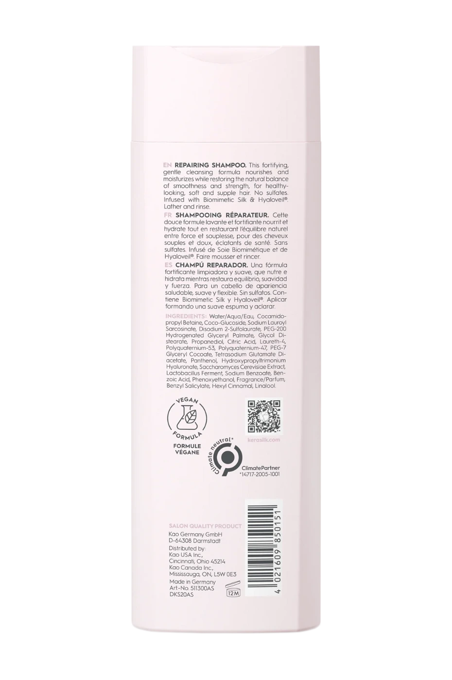 Obogaćen je biomimetičkom svilom i Hyaloveilom®, naprednim sastojcima koji dubinski obnavljaju kosu, štite je od vanjskih utjecaja i pomažu u zadržavanju vlage.