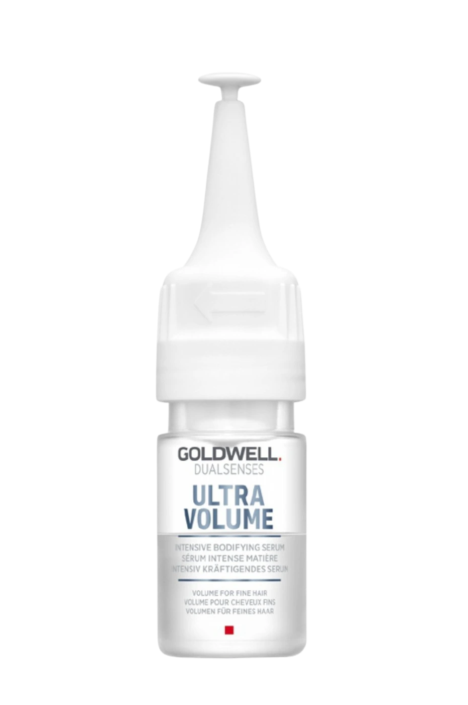 Goldwell Dualsenses Ultra Volume Bodifying Intensive Conditioning serum pruža trenutačnu njegu i jačanje kose duž cijele vlasi, od korijena do vrhova, ostavljajući kosu punijom, otpornijom i vidljivo zdravijom. Idealan je kao priprema prije stiliziranja jer kosi osigurava volumen, sjaj i toplinsku zaštitu – bez osjećaja težine.